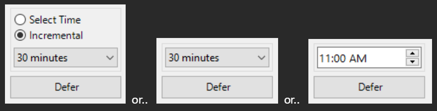 # Example: Show-DeferPrompt -DeferLimit 2[default] -DeferTimeOptions ShowBoth[default]/IncrementalOnly/SelectTimeOnly -DeferTimeIncrements '15m,30m,1h,4h,8h' -DeferCountdownTimer '300' -DeferDefaultTimeOption Incremental[default]/SelectTime -NetworkRequired 'google.com' -ShowBalloon $True[default]/$False -TopMostDefer $True[default]/$False -ShowMinimizeButton $True/$False[default] (Parameters are not required)