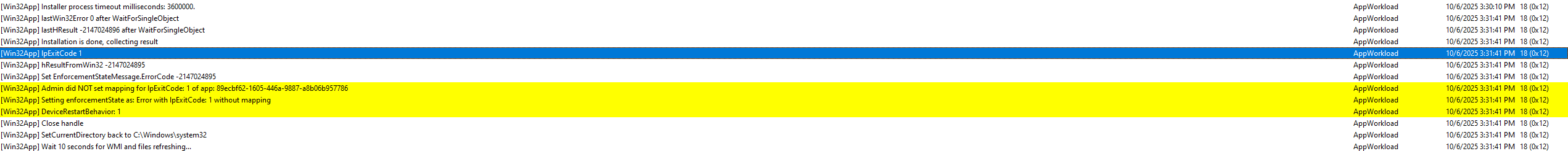 However, in Intune, the installation result is reported as exit code 1, as if PSADT didn’t pass the return code back to the Intune process properly.